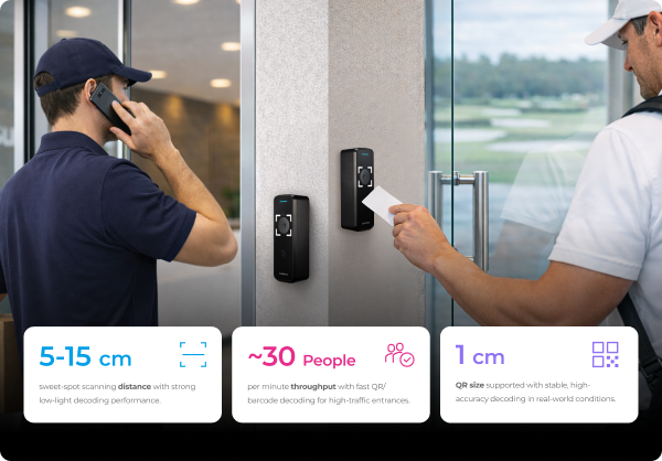 Với những khu vực có lưu lượng lớn, tốc độ và độ ổn định là yếu tố quyết định. XPass Q2 được thiết kế để quét QR và barcode gần như tức thì, giúp duy trì luồng di chuyển liên tục ngay cả trong giờ cao điểm.